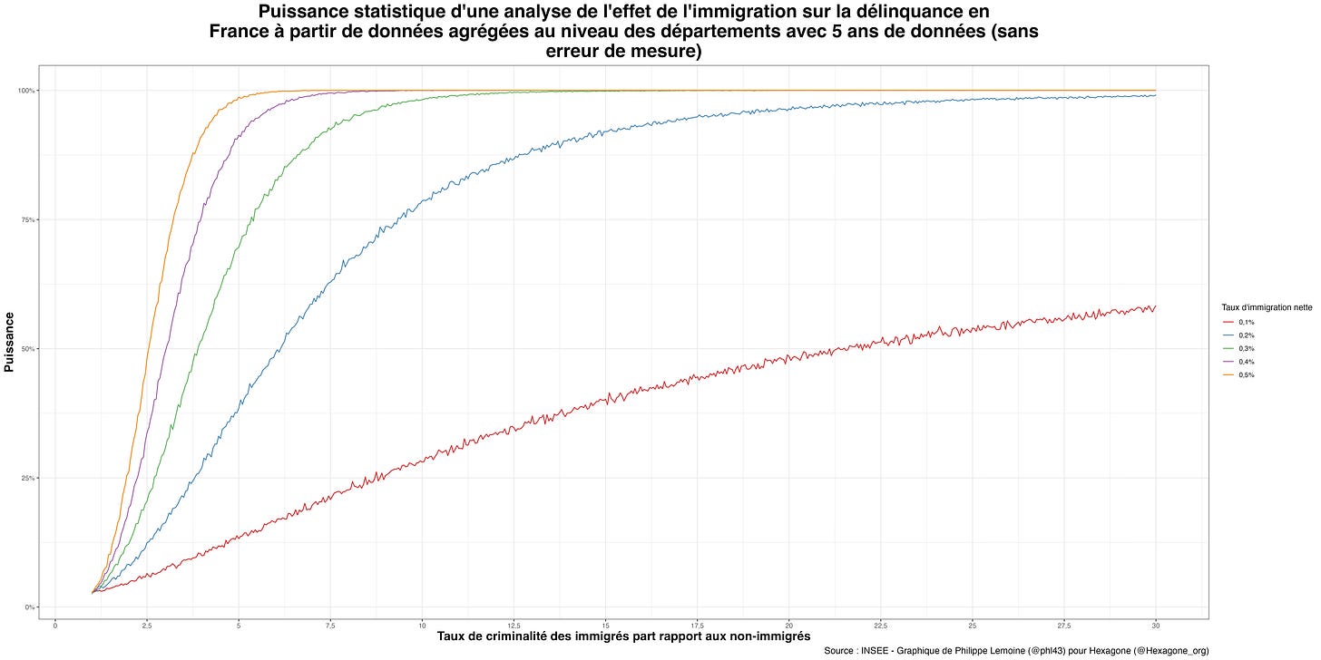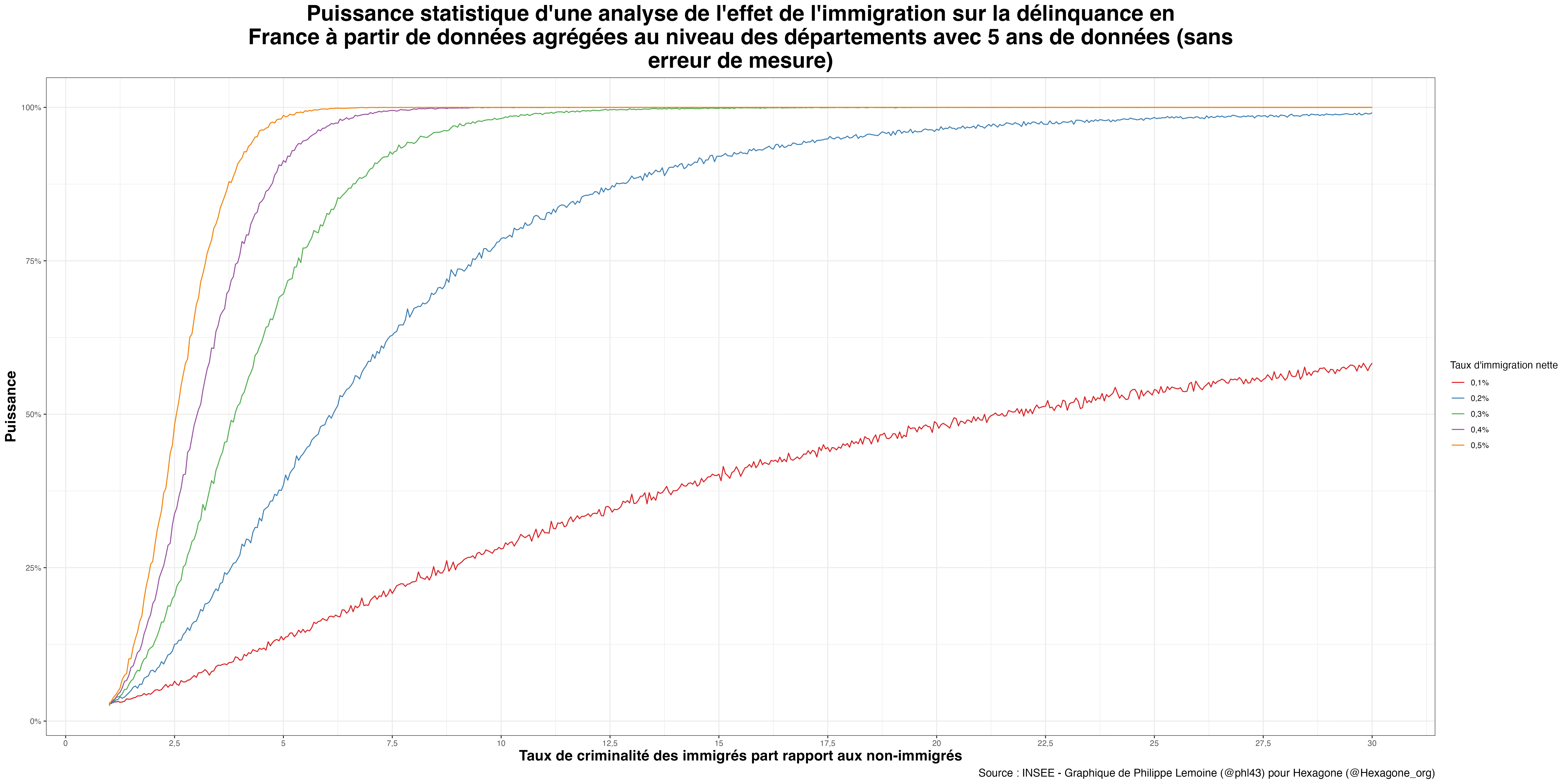 Comme on peut le voir sur ce graphique, avec un changement de la part des immigrés dans les départements d’une année à l’autre de 0,1% en moyenne (ce qui correspond à peu près au solde migratoire français depuis une quinzaine d’années), même si les immigrés commettaient des crimes violents à un taux 30 fois supérieur aux non-immigrés, le type d’analyse économétrique dont parlent Philippe et Valette n’aurait qu’une puissance d’environ 56%. Autrement dit, même si les immigrés avaient un taux de criminalité 30 fois supérieure aux autochtones, dès lors que les flux d’immigration sont similaires à ceux que la France connaît habituellement, une telle analyse n’aurait qu’un peu plus d’une chance sur deux de trouver un effet statistiquement significatif. Même si les flux d’immigration étaient deux fois plus importants, pour qu’une étude de ce type ait seulement une chance sur deux de conclure à l’existence d’un effet sur la délinquance, il faudrait que les immigrés commettent des crimes violents à un taux environ 6 fois supérieur à celui des autochtones.