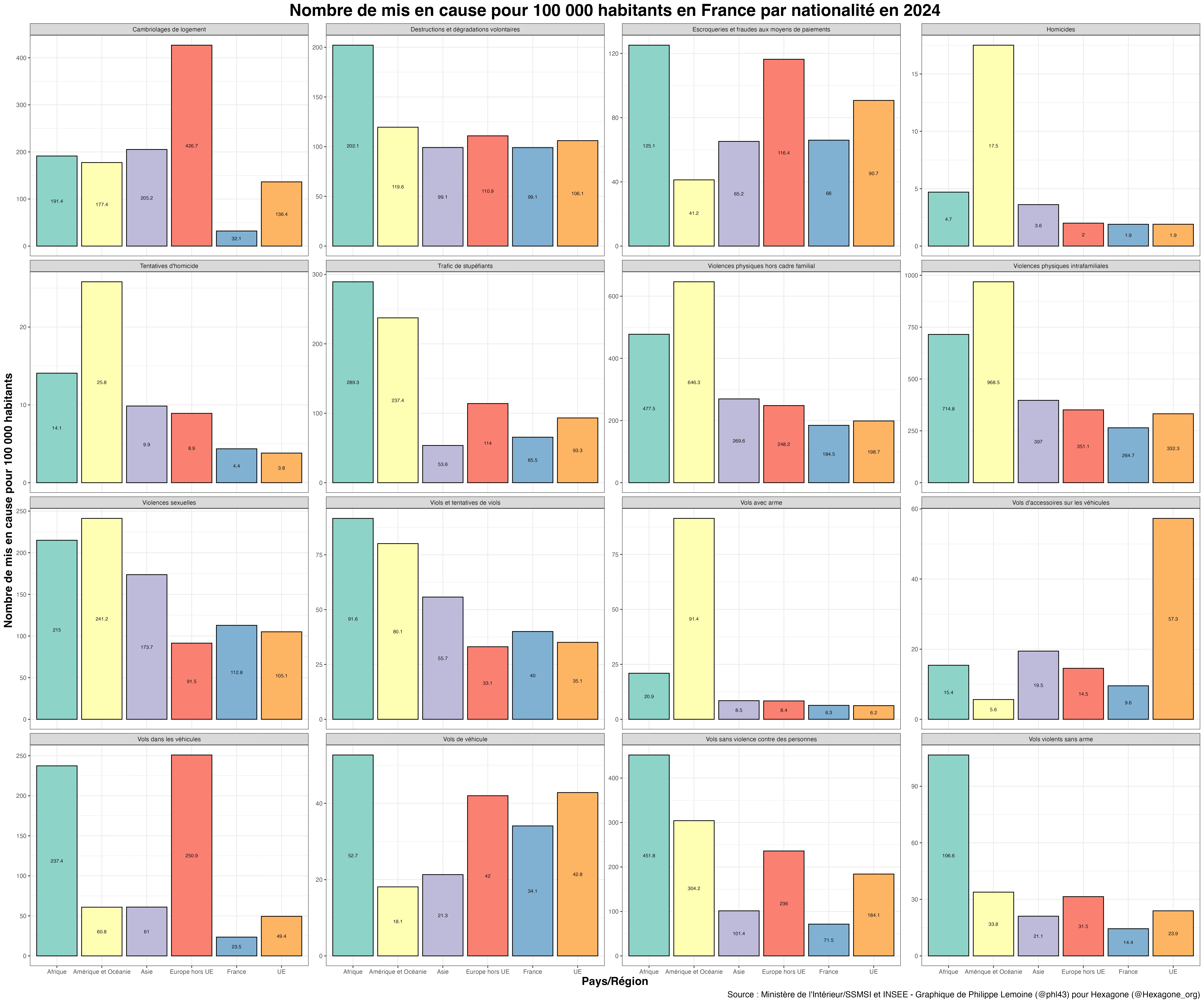 On voit que le taux de mise en cause varie considérablement non seulement en fonction de la nationalité mais aussi en fonction du type d’infraction. Par exemple, dans les affaires de vols avec violence sans arme, les personnes de nationalité africaine sont mises en cause à un taux environ 6,3 fois supérieur à celui des personnes de nationalité française.