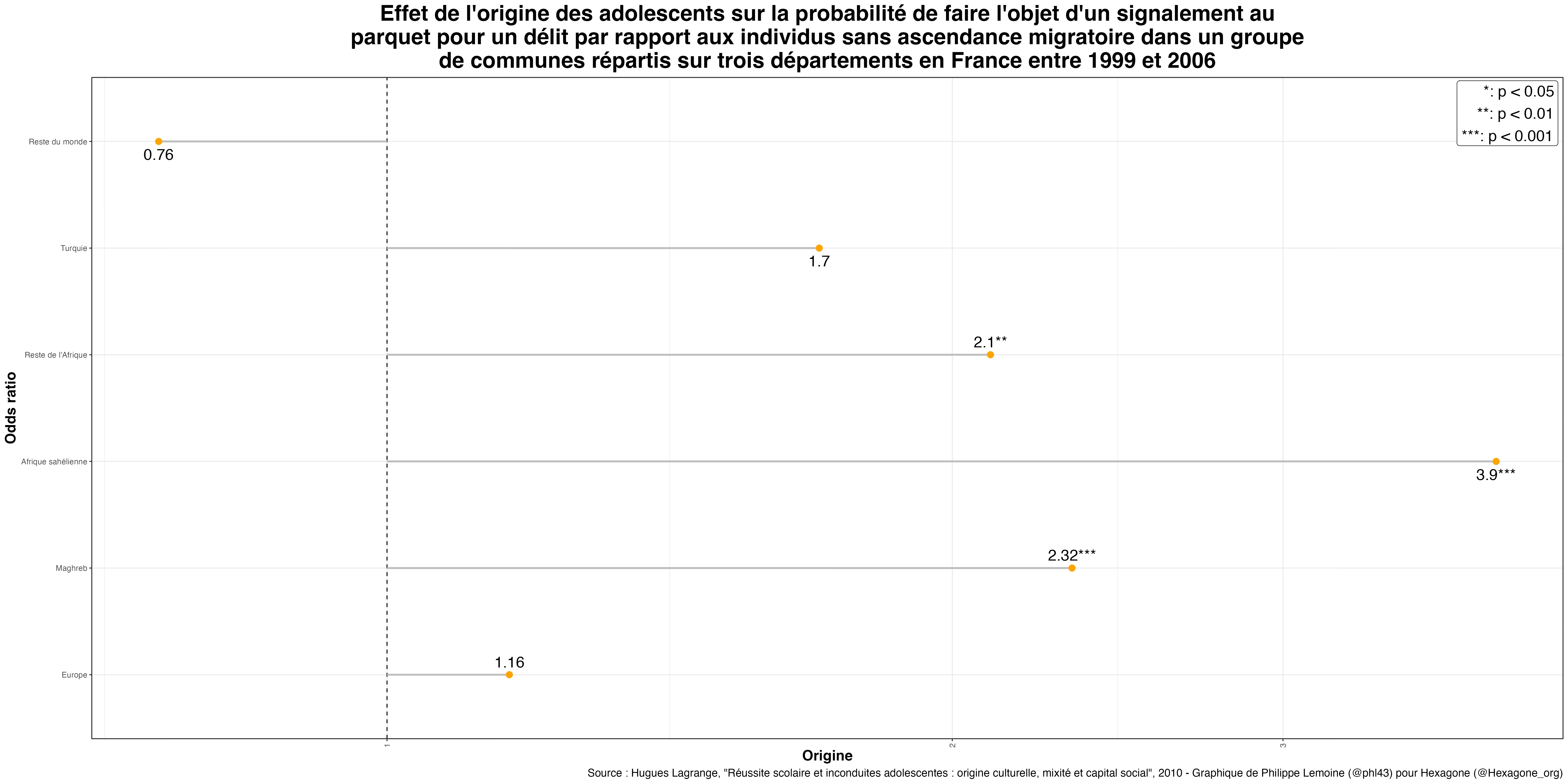 Malheureusement, il n’existe pas beaucoup d’études sur le sujet en France, où contrairement aux pays scandinaves il n’y a pas de registre de population. En théorie, on pourrait apparier les données des enquêtes sur les immigrés et leurs descendants comme Trajectoires et origines avec les données sur les personnes mises en cause par la police ou condamnées par la justice, mais à ma connaissance ça n’a jamais été fait. On dispose toutefois d’une étude de Hughes Lagrange qui, avec une collaboratrice, a collecté des données sur près de 3 500 adolescents scolarisés dans des collèges publics entre la fin des années 1990 et le début des années 2000 dans 155 IRIS situés dans les Yvelines, le 18ème arrondissement de Paris et Saint-Herblay en banlieue nantaise.19 Outre des informations sur leurs caractéristiques individuelles et familiales (le sexe, le type de famille et la catégorie socio-professionnelle du père ou de la mère dans le cas des familles monoparentales), ainsi que celles des quartiers où ils vivaient (la proportion d’élèves en ZEP, la classification du quartier en ZUP, la proportion de familles africaines et la proportion de cadres), ils ont aussi dépouillé les procès-verbaux transmis par les services de police au parquet concernant l’ensemble des adolescents pour des affaires de vols, violences, dégradations, recels, usages de drogues illicites et menaces.