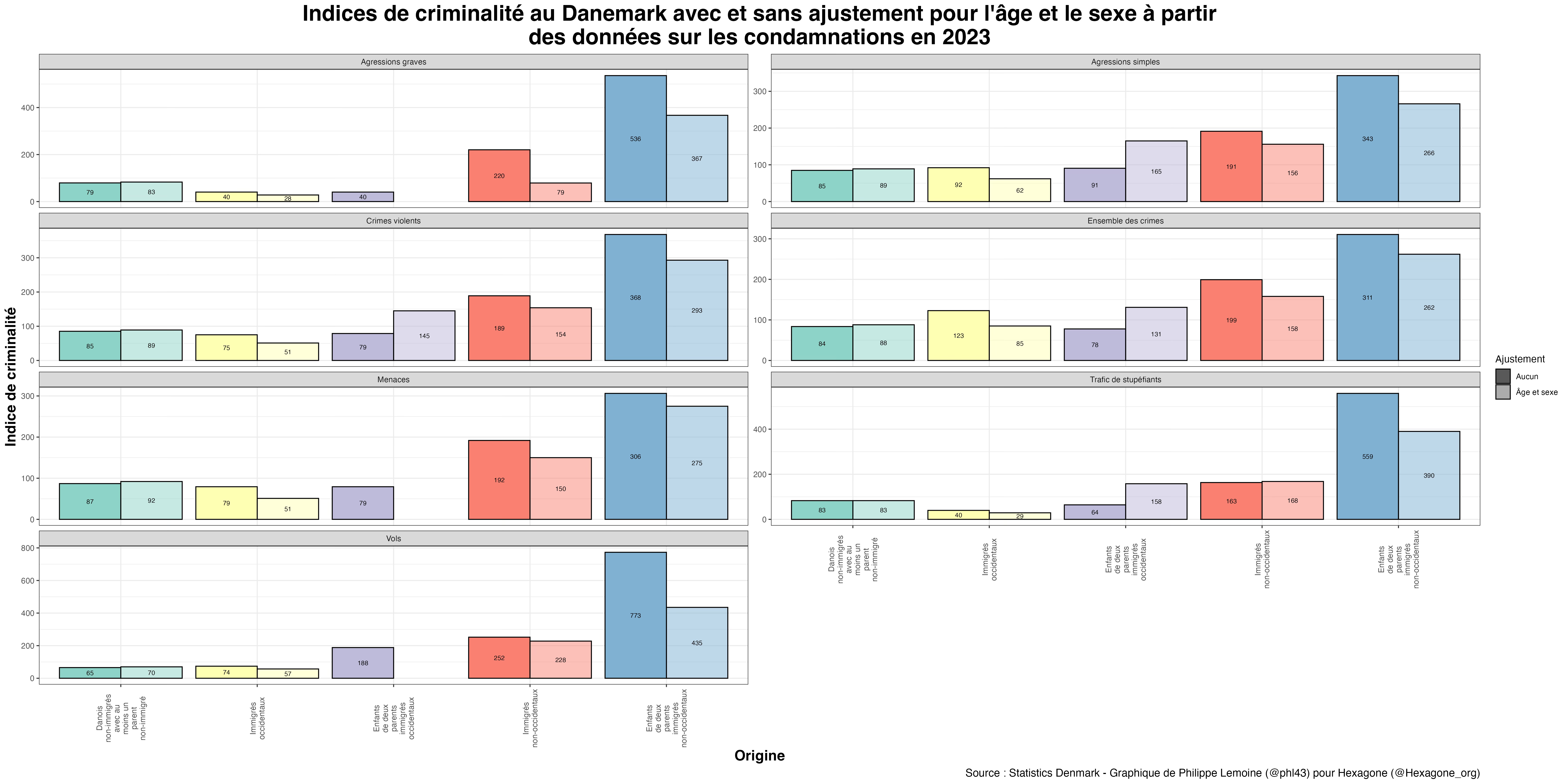 Par exemple, l’équivalent danois de l’INSEE publie régulièrement des chiffres sur les personnes condamnées au Danemark en fonction de l’origine, dans lesquels l’institut statistique danois procède aussi à un ajustement statistique qui permet de comparer les immigrés et leurs enfants avec le reste de la population à âge et sexe égal. Pour cela, l’institut calcule un taux de condamnation par sexe et âge pour chaque groupe, puis à partir de ces taux de condamnation il calcule un indice pour chaque groupe obtenu en lui attribuant la même distribution par âge et sexe que la population dans son ensemble. Les résultats de cette analyse montrent de manière très claire que les caractéristiques démographiques des immigrés et de leurs enfants sont loin d’expliquer l’intégralité ou même la majorité des différences de taux de condamnation :