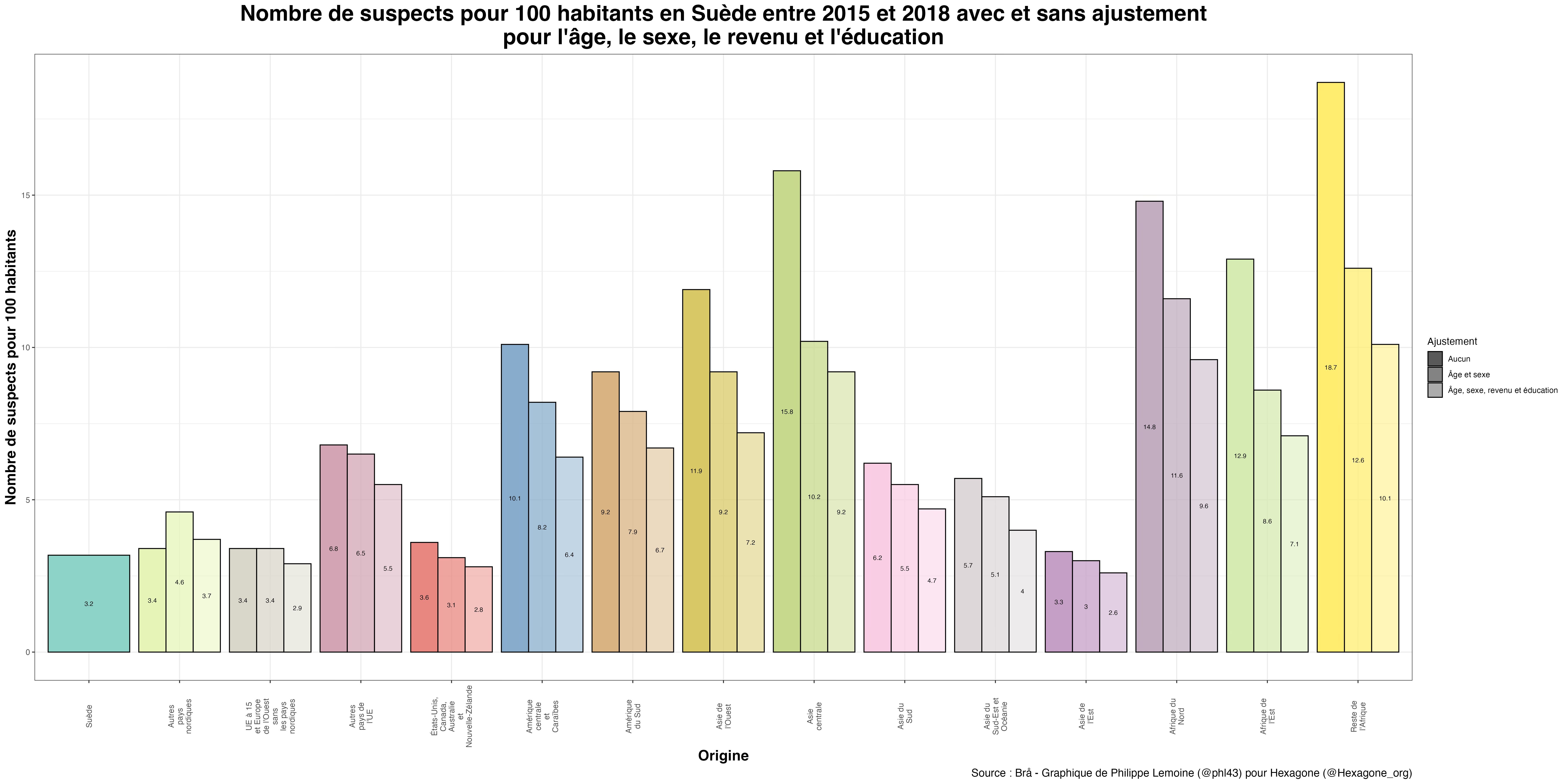 Philippe et Valette avancent également que les immigrés sont plus défavorisés socialement que le reste de la population, ce qui expliquerait pourquoi ils commettent plus souvent des crimes que le reste de la population. Mais encore une fois, même en admettant que cet argument a du sens dans le cadre du débat sur l’impact de l’immigration sur la délinquance (ce qui n’est pas le cas pour des raisons que j’expliquerai plus bas), il n’existe aucune preuve que la surreprésentation des immigrés dans les statistiques de la délinquance disparaisse dès lors qu’on fait une comparaison à caractéristiques socio-économiques égales. Par exemple, l’agence nationale suédoise en charge des statistiques sur la criminalité a réalisé une étude du même type que l’analyse danoise dont j’ai parlé à l’instant, mais au lieu de standardiser les taux de condamnation en prenant en compte uniquement les différences d’âge et de sexe, elle a utilisé les données sur les personnes suspectées par la police et aussi tenu compte des différences de revenu et d’éducation en plus de l’âge et du sexe. Concrètement, elle a calculé le nombre de suspects par habitant pour chaque combinaison de groupe d’âge, de sexe, de niveau de revenu et d’éducation, puis a utilisé les taux de suspicion ainsi obtenus pour calculer le taux de suspicion qu’aurait chaque groupe s’il était distribué de la même façon que les Suédois non-immigrés dont les deux parents sont nés en Suède en termes d’âge, de sexe, de revenu et d’éducation.14
