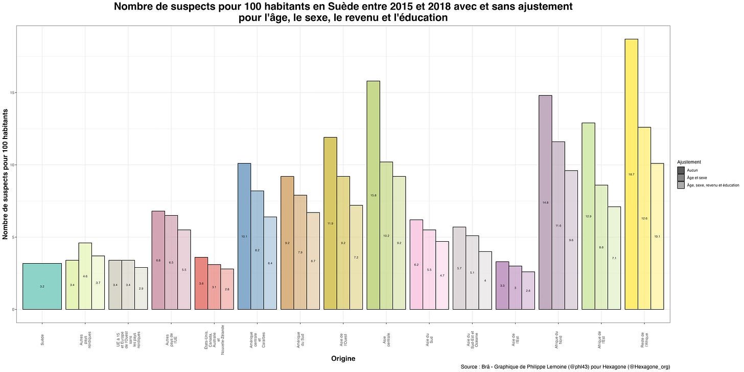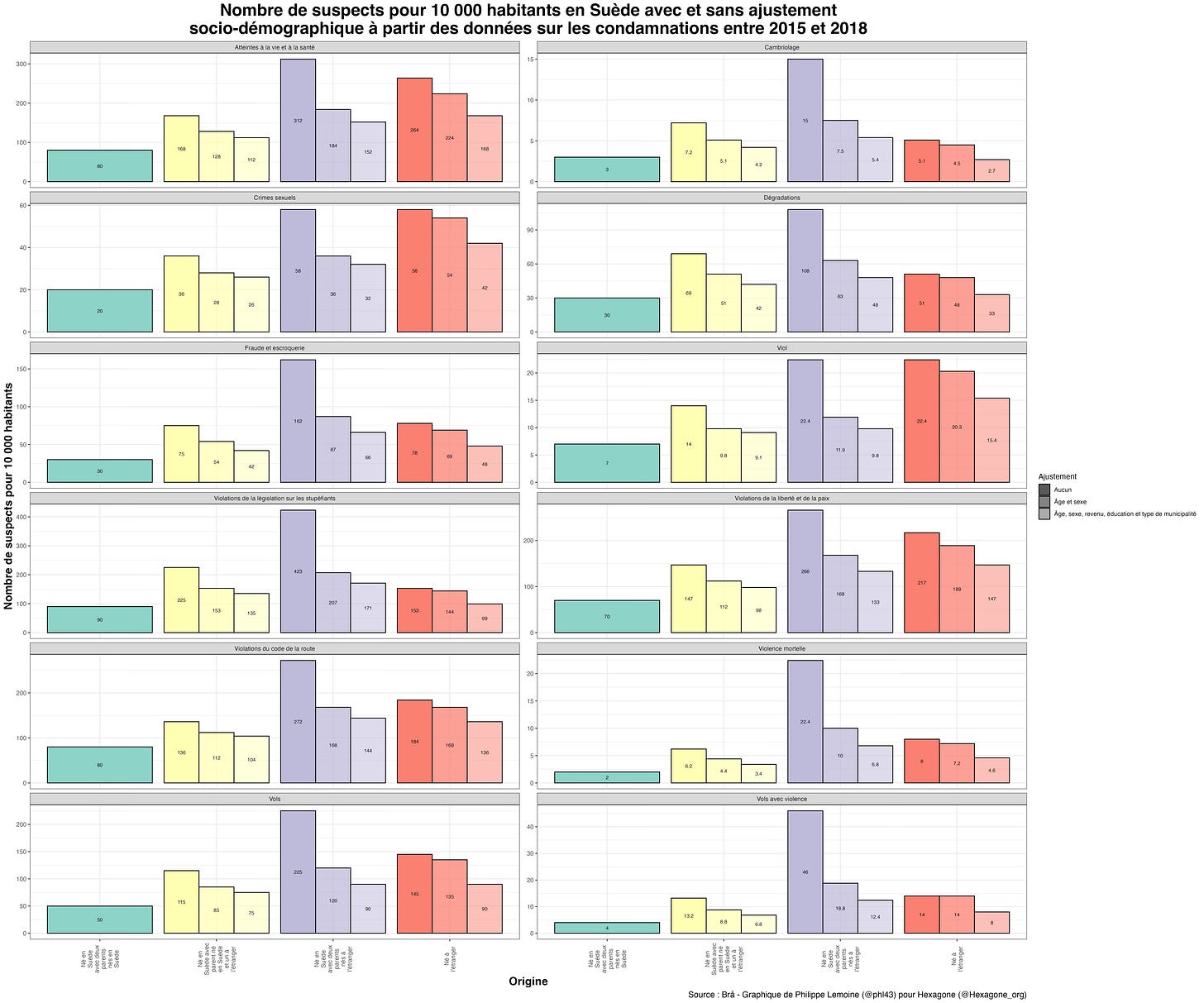 Pour certaines analyses, l’agence a aussi tenu compte du type de municipalité dans lequel vivaient les suspects, mais ce n’est pas le cas quand elle désagrège le groupe des immigrés et leurs enfants selon leur origine géographique, probablement parce que les cellules dans l’échantillon étaient trop petites.