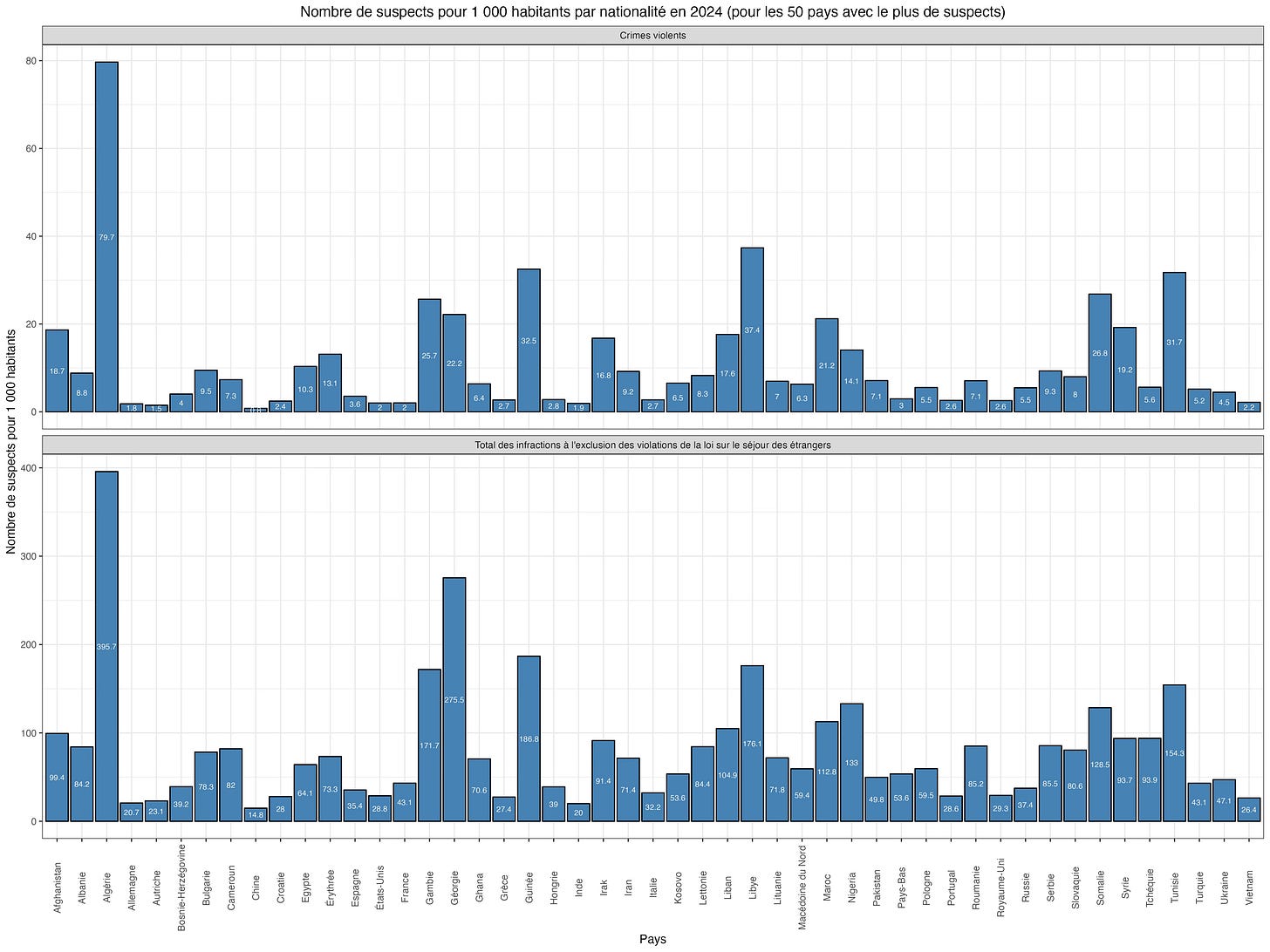 Cette surreprésentation des étrangers ne se limite pas aux tentatives d’homicide, mais s’observe à des degrés divers pour tous les types de crimes dans les données de la police et de la gendarmerie :