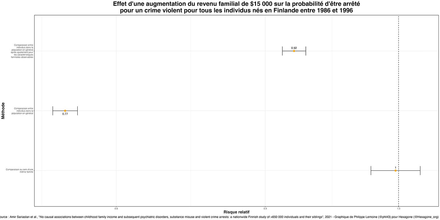 Une autre stratégie consiste à comparer l’association entre revenu et criminalité dans la population en général avec l’association entre frères ou soeurs au sein d’une même famille. L’idée est que, dans la mesure où les facteurs qui pourraient créer une association trompeuse entre revenu et criminalité dans la population parce qu’ils influencent à la fois le revenu et la criminalité sont communs aux membres d’une même famille (gènes, culture, éducation, etc.), cette association devrait être réduite voire disparaître quand on l’estime au sein d’une même famille. Le revenu familial peut varier même quand on compare des membres de la même famille parce que les membres d’une même fratrie naissent à des moments différents et que le revenu d’un ménage varie dans le temps. De fait, une étude portant sur plus de 650 000 individus en Finlande qui a utilisé cette méthode a trouvé que l’association entre revenu et criminalité violente, qui est très claire quand on s’intéresse à la population dans son ensemble (même quand on procède à des ajustements statistiques pour comparer des gens qui ont des caractéristiques observables identiques), disparaissait quand on compare uniquement des frères ou soeurs dans la même famille :