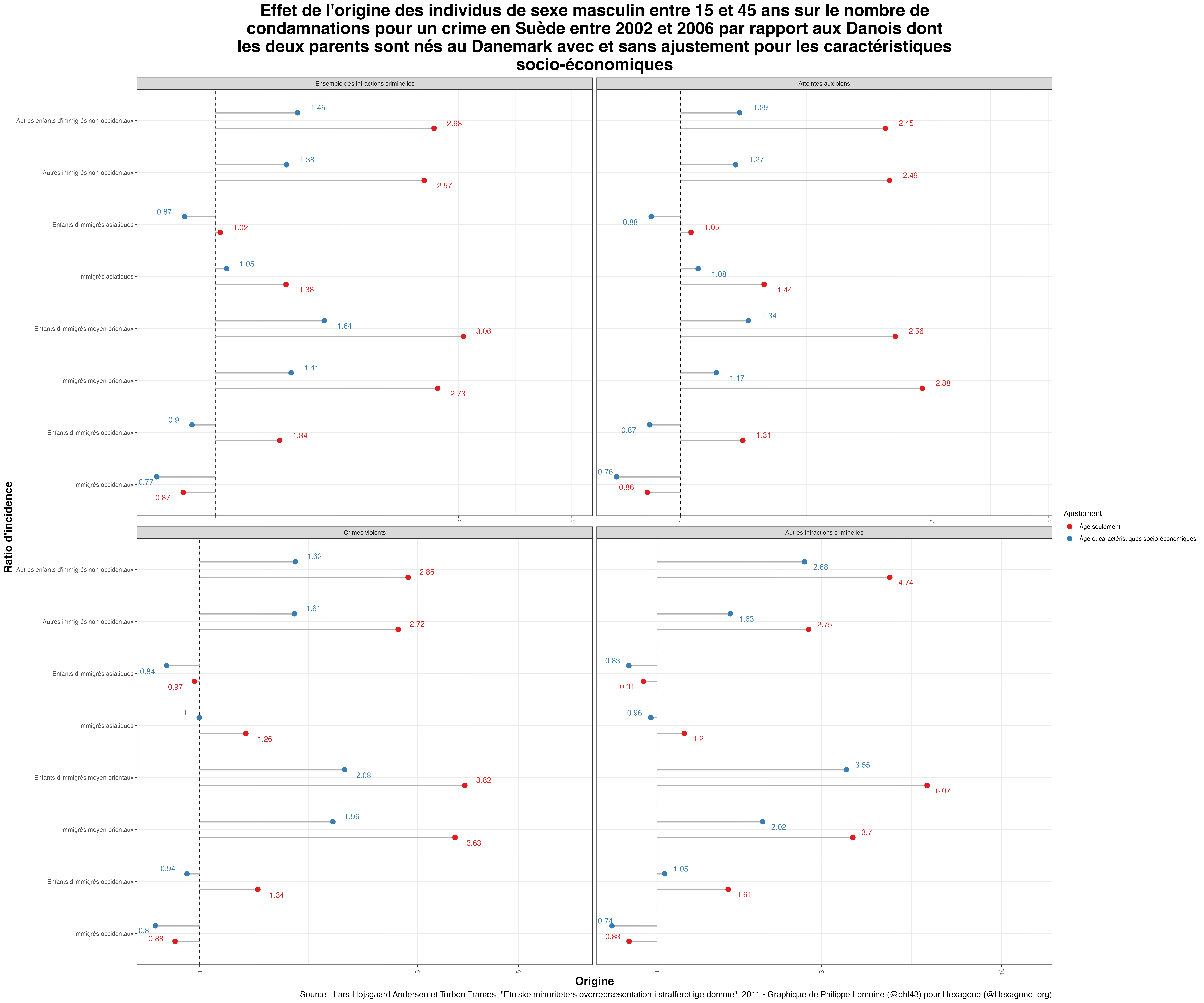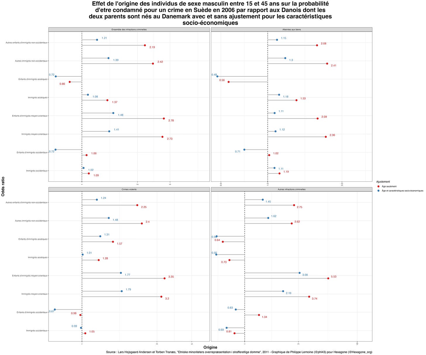 Encore une fois, la Suède n’est pas une exception, d’autres études ailleurs en Europe, comme l’étude sur les personnes suspectées par la police aux Pays-Bas que j’ai déjà citée plus haut, ont trouvé des résultats similaires. On pourrait éventuellement objecter que, dans la plupart des cas, les ajustements statistiques auxquels procèdent ces études restent grossiers et que par conséquent on ne peut pas exclure qu’avec des ajustements plus fins les différences entre groupes disparaîtraient. Par exemple, dans le cas de l’étude suédoise que je viens de citer, les variables sur le revenu et l’éducation sont très grossières, puisque la première distingue seulement les personnes dans le premier quartile de revenu du reste de la population tandis que la seconde distingue seulement les personnes n’ayant pas fini le lycée du reste de la population. Il existe cependant une étude danoise qui contrôle pour les caractéristiques démographiques et socio-économiques de manière beaucoup plus précise, mais cela ne suffit pas pour autant à faire disparaître les différences entre groupes (que ce soit en termes de la probabilité d’être condamné ou du nombre de condamnations), qui restent parfois très importantes.