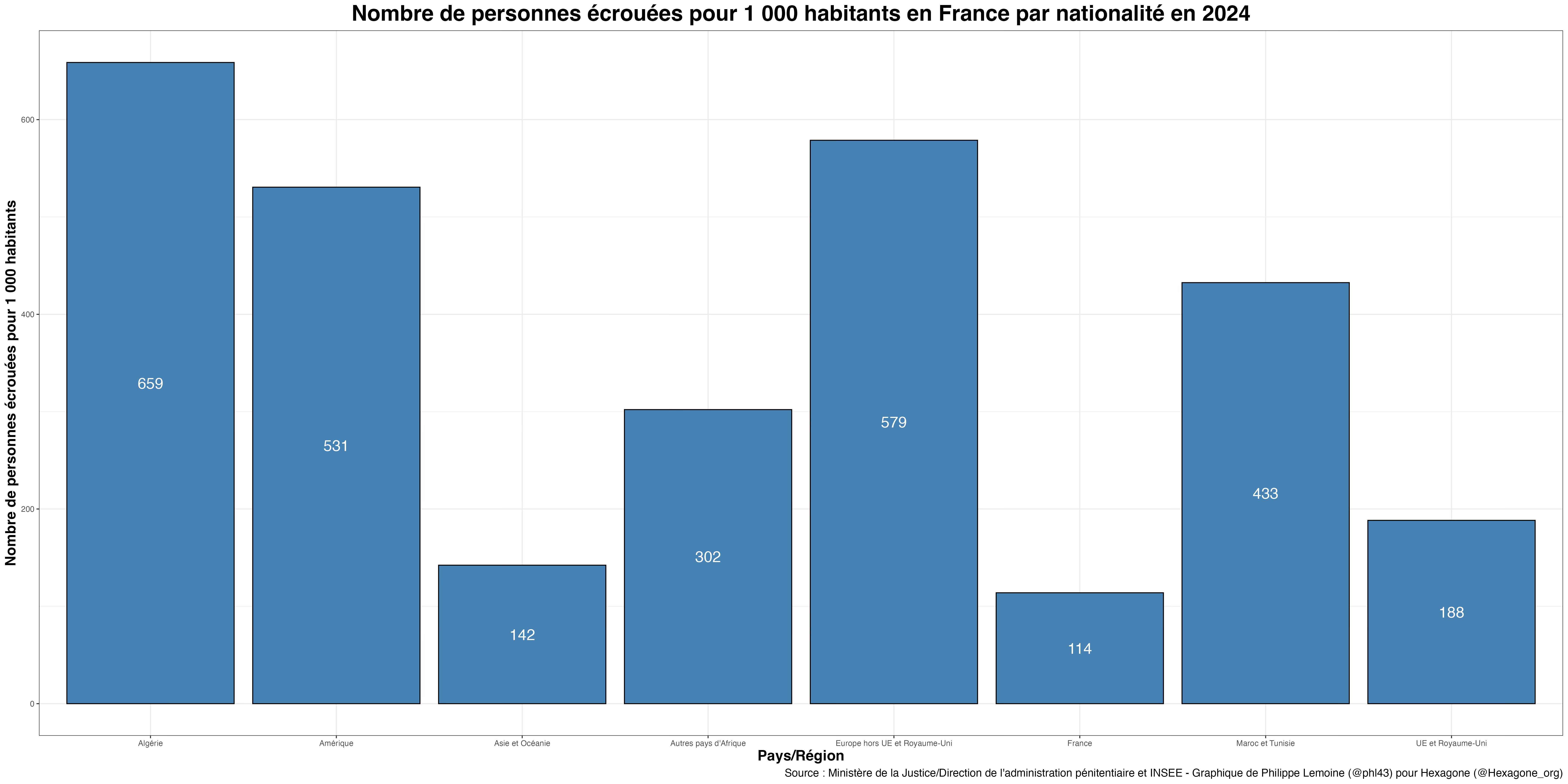 3 668 / 996 000 ≈ 368 personnes sous écrou pour 100 000 habitants en 2024.