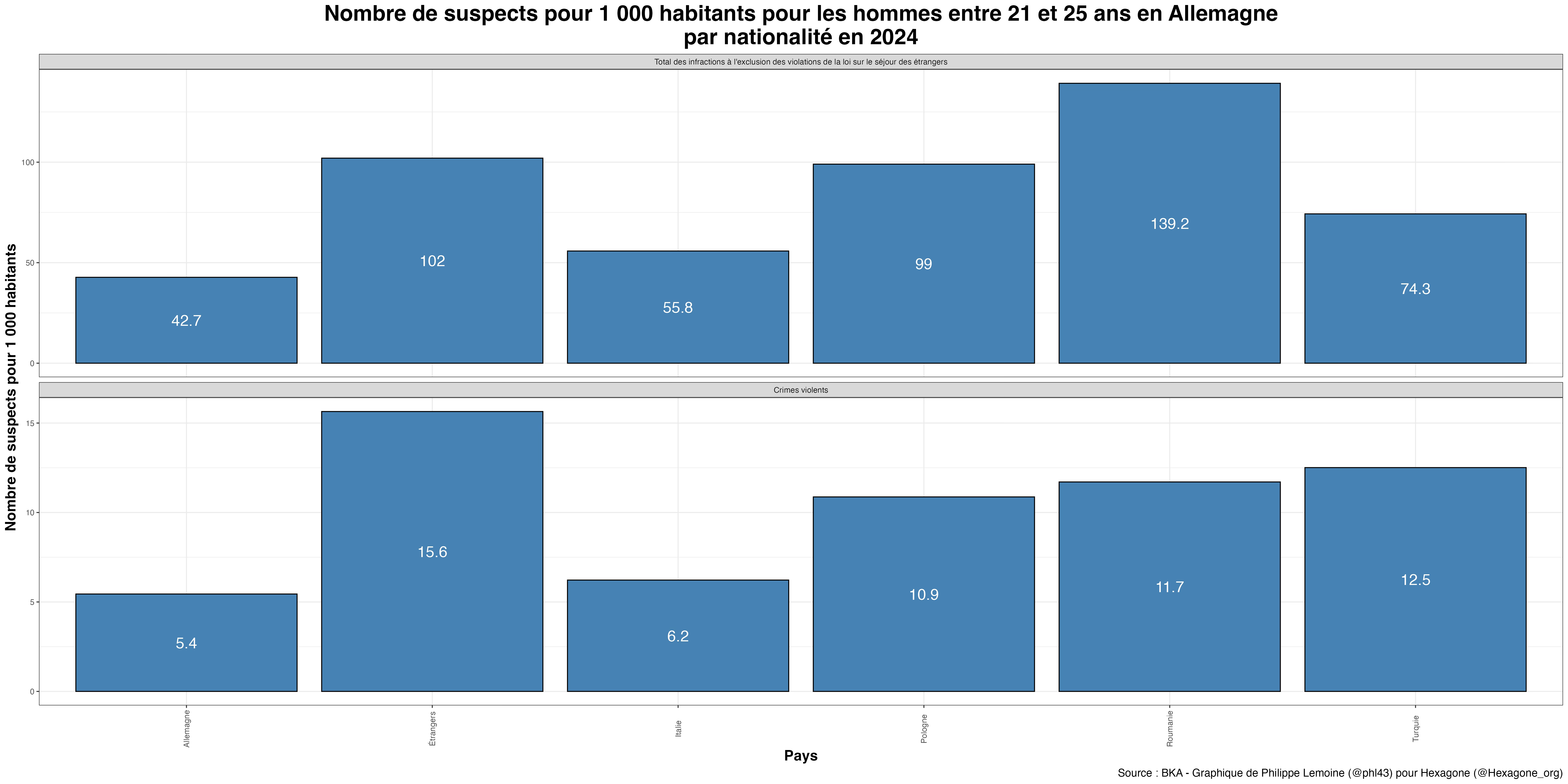 On voit que les étrangers sont soupçonnés par la police à un taux 2,4 fois supérieur à celui des Allemands dans le cas des infractions dans leur ensemble et 2,9 fois supérieur dans le cas des crimes violents.